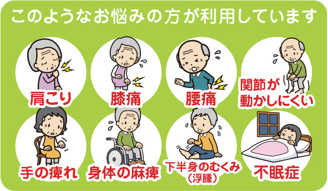 筋肉の麻痺や関節の拘縮などの症状で歩行困難や寝たきり状態の方、医師からマッサージの必要性が認められた方は健康保険が適用されます。