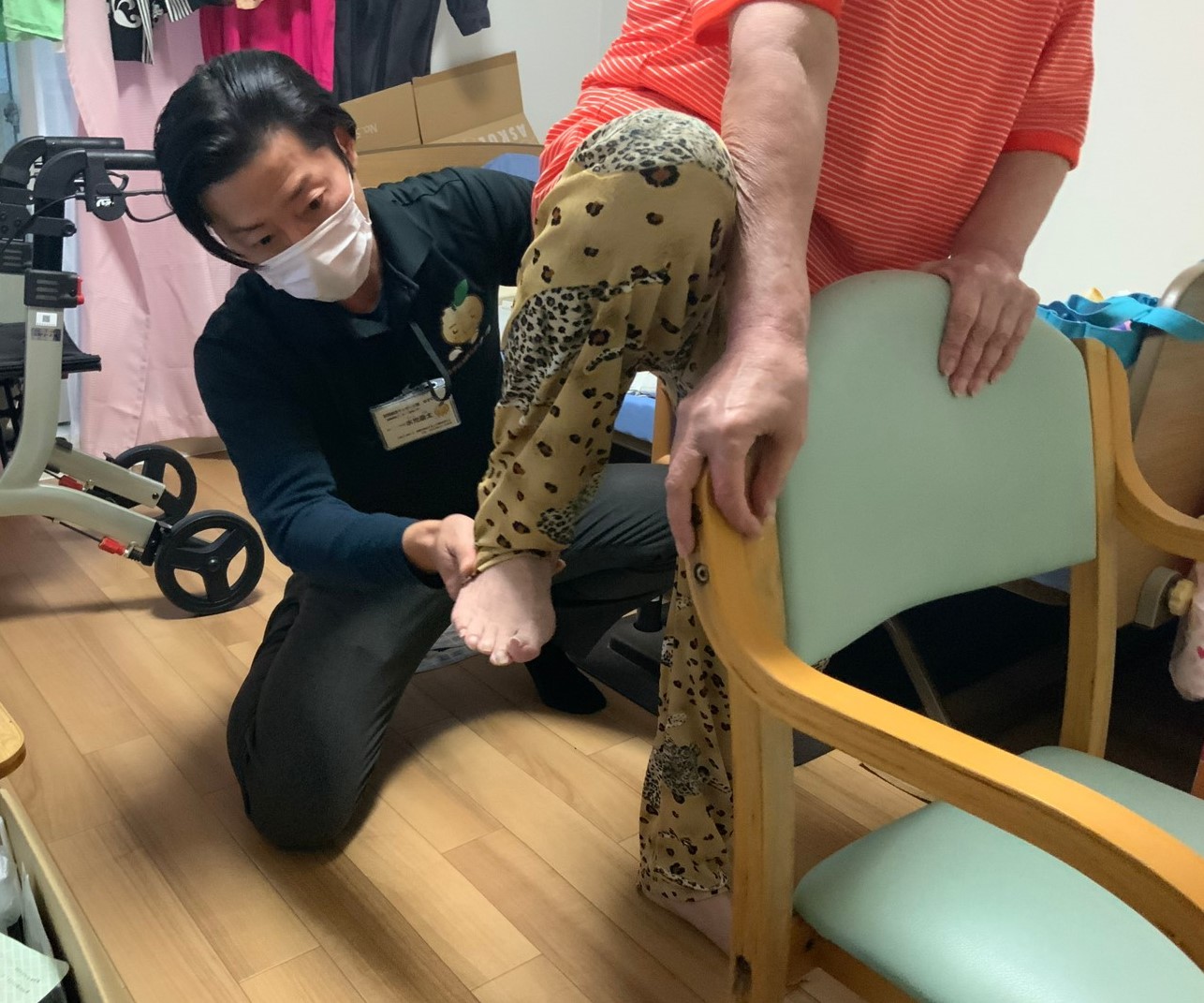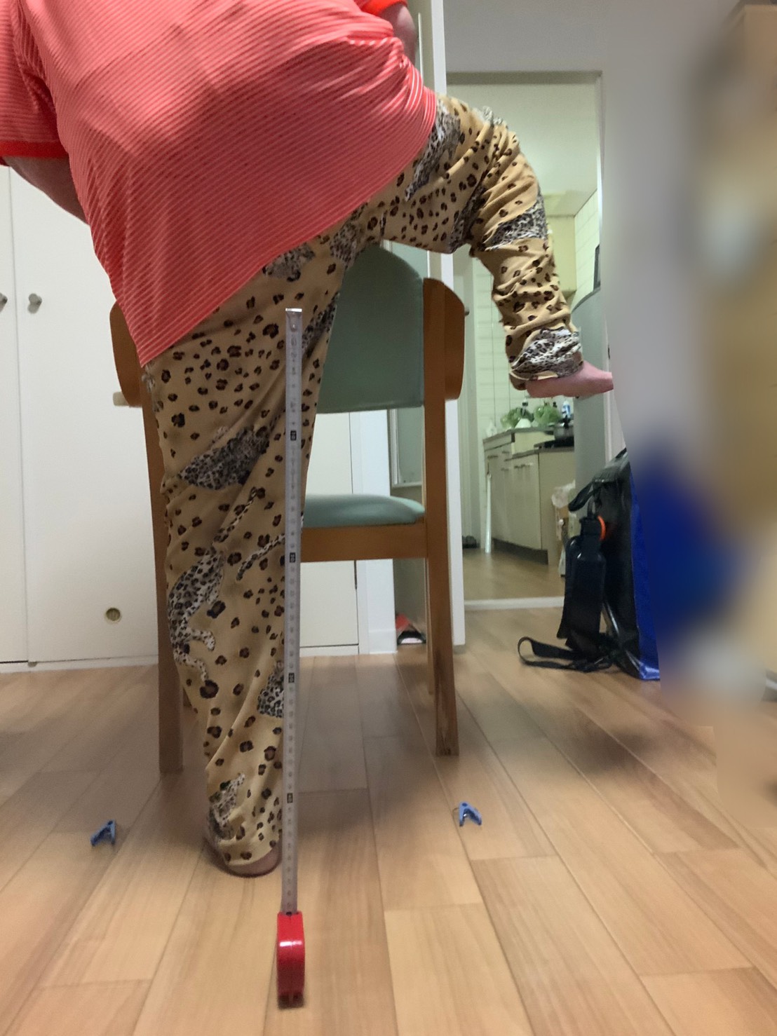 そこで、自宅の浴槽の高さとまたぐ距離を数値化し、まずはリビングなどで椅子や手すりなどを持って、またぎ動作のトレーニングをします。この時、転倒する危険があるので、後ろで補助します。また最初身体が安定しない時は、椅子の代わりに介助しながらでもかまいません。